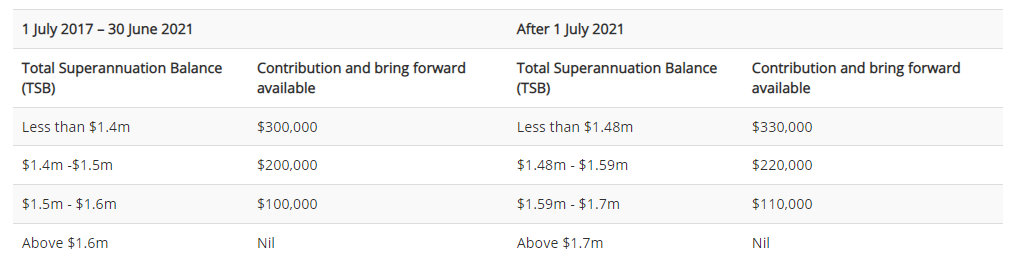 The bring forward rule enables you to contribute up to three years’ worth of non-concessional contributions in the one year. That is, from 1 July 2021, you could contribute up to $330,000 to your superannuation in one year. You can use the bring forward rule if you are 64 or younger on 1 July of the relevant financial year of the contribution and the contribution will not increase your total super balance by more than your transfer balance account cap.